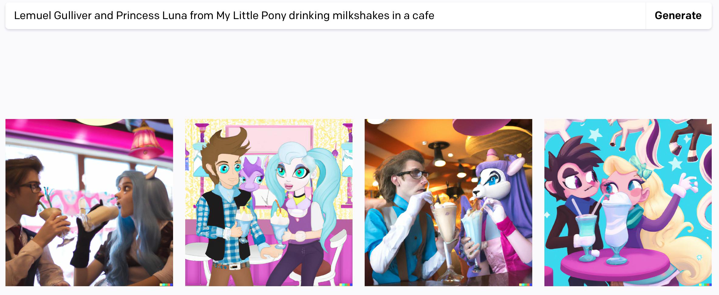 https://www.equestriadaily.com/2023/10/the-huge-struggle-of-pony-posting-in.html). I find DALL-E 2 totally incompetent. See the attached responses to a request for a picture of "Lemuel Gulliver and Princess Luna from My Little Pony drinking milkshakes in a cafe." I don't have access to DALL-E 3, but the contrasting v.2 vs. v.3 specimens on the OpenAI website don't show an overwhelming improvement in the latest version — at least, not to my eyes.